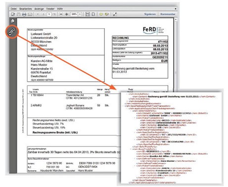 ZUGFeRD: Eine ZUGFeRD-Rechnung besteht aus einer für den Menschen lesbaren visuellen Darstellung im PDF/A-3-Standard und einer eingebetteten maschinenlesbaren codierten XML-Datei. Bedeutet konkret: Grundsätzlich besteht eine ZUGFeRD-Rechnung aus einem XML-Code und wird durch ein klassisches Rechnungsdesign als PDF ergänzt.