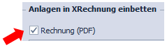 Wenn Anlagen mitgesendet werden, oben links den Button „Anlage einfügen“ klicken. Hier kann ein Dokument vom Server ausgewählt werden. Alternativ kann auch über "Dokument einfügen" ein Dokument aus dem Dokumenten-Archiv eingefügt werden. Nach dem auswählen/öffnen werden die Dateien rechts in der Tabelle aufgelistet.- Ebenfalls kann man die Rechnung als Anlage in die X- rechnung einbetten. Dazu muss dieser Haken gesetzt werden: