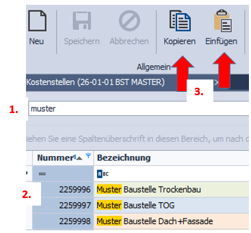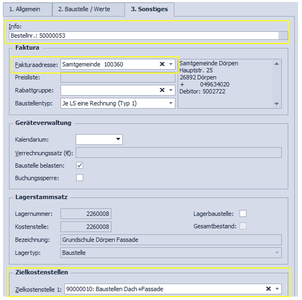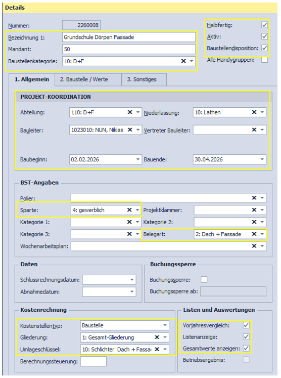 - Muster-Baustelle des Mandanten suchen. Bei den Musterbaustellen sind div. Voreinstellungen schon gesetzt