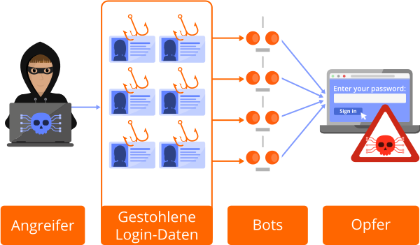 Credential Stuffing ist ein Brute-Force-Angriff, bei dem ein Hacker gestohlene Benutzernamen und Passwörter nutzt, um zu versuchen, sich mit diesen Anmeldedaten auf verschiedenen Webseiten einzuloggen. Diese Daten werden häufig aus Datenlecks von Unternehmen und Webseiten gewonnen und im Dark Web verkauft.