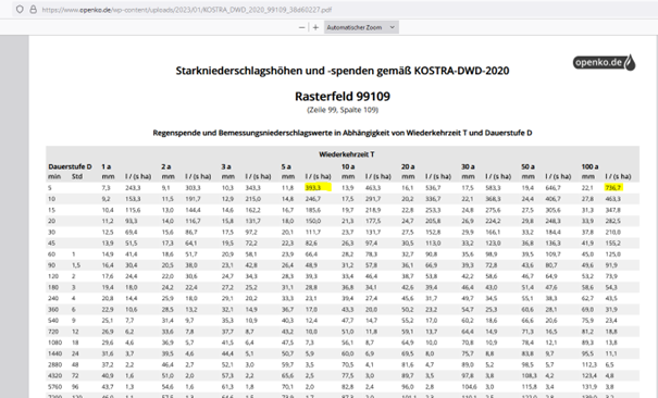 Bei der Wahl der Regenspende sind die Werte der DIN 1986-100 vorgegeben.