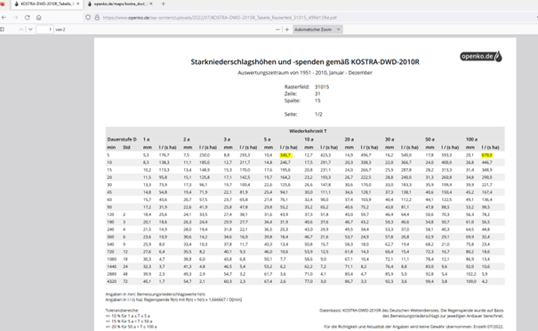 Nicht wundern das hier noch andere Werte stehen, dass sind noch die alten Werte für Stavern, allein in Stavern haben sich die Werte um 50 ltr. Regen 5 min/100 Jahre erhöht.