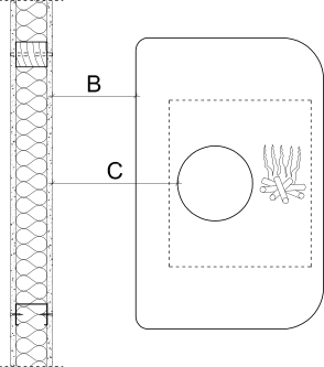1. Der Abstand von Öfen (B) und Rauchrohren (Verbindungsstücken) (C) zu Metall- oder Holzständerwänden sowie Massivholzwänden mit Gips- oder Gipsfaserplatten-Beplankung richtet sich nach den jeweiligen Angaben der Ofenhersteller und ist wie beim Abstand zu brennbaren Baustoffen einzuhalten.