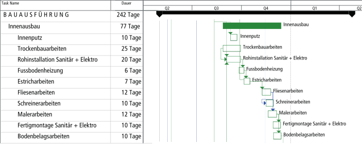 In einem Balkenplan wird ersichtlich, wann welche Arbeiten ausgeführt werden sollen und welche zeitgleich ausgeführt werden.