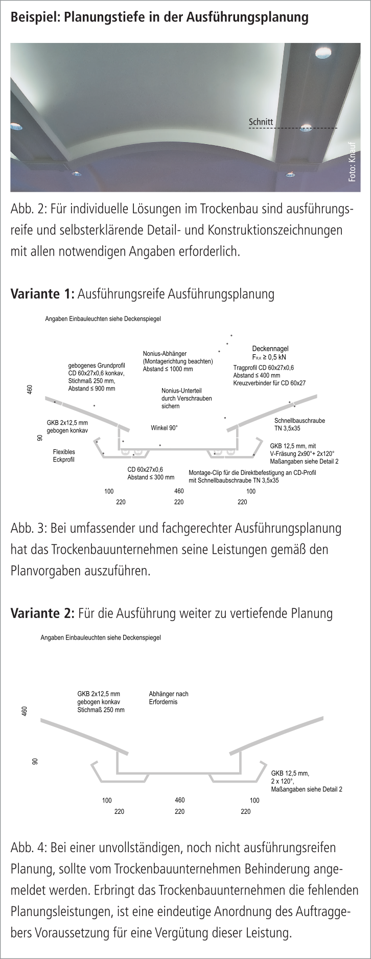 Die Ausführungsplanung des Architekten bestimmt maßgeblich die technische Leistungsfähigkeit von Trockenbausystemen. Die Ausführungsplanung muss demnach derart sein, dass sie die vollständige und fachlich richtige Umsetzung aller mit der jeweiligen Bauaufgabe gestellten Anforderungen durch alle Ausführungsbeteiligten ermöglicht. Die Ausführungsplanung ist in der Regel weiterhin Grundlage für das Erstellen von Leistungsverzeichnissen. Nur mit einer fachgerechten Ausführungsplanung lassen sich die in dem Leistungsverzeichnis definierten Anforderungen und Eigenschaften von den zu erstellenden Trockenbaukonstruktionen, z.B. an den Schallschutz oder Brandschutz, realisieren. Die dem Trockenbauunternehmen geschuldete ausführungsreife Darstellung entspricht den an sie gestellten Anforderungen, wenn sie zwei Grundvoraussetzungen erfüllt.