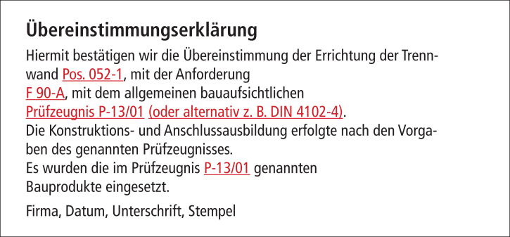 Mit einer „Übereinstimmungserklärung“ bescheinigt das Fachunternehmen dem Auftraggeber, dass die von ihm erstellte „Bauart“ (Trockenbaukonstruktion) unter Beachtung der relevanten technischen Regeln z.B. den geltenden DIN-Normen, Zulassung, Prüfzeugnis, Bauartgenehmigung oder einer Zustimmung im Einzelfall erstellt worden ist. Diese Übereinstimmungserklärung kann formlos erfolgen. Die Übereinstimmungserklärung kann folgende Angaben enthalten: Eine Übereinstimmungserklärung kann baurechtlich gefordert sein, z.B. als Teil eines allgemeinen bauaufsichtlichen Prüfzeugnisses oder im Leistungsverzeichnis vereinbart.