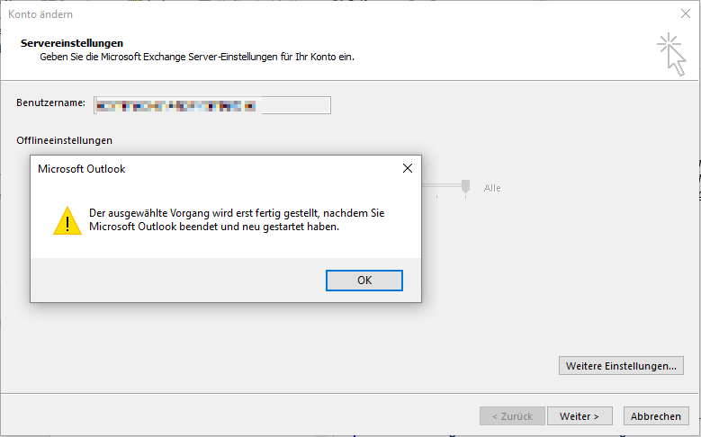 Es öffnet sich das Fenster Konto ändern. Klicke auf Weitere Einstellungen und bestätige den Warnhinweis mit OK.