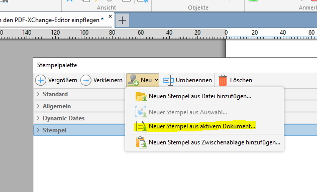 Öffne anschließend eine beliebige PDF-Datei im pdf-x-change-Viewer oder Editor. In der oberen Menüleiste klickst du auf „Stempel“, gefolgt von dem nach unten zeigenden Pfeil. Wähle dann „Stempelpalette“ und klicke auf „Neu“.