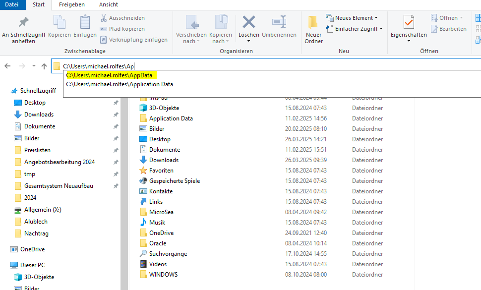 Es kann sein, dass der Ordner "AppData" nicht sichtbar ist, dann bitte in der Explorer-Leiste eingeben.