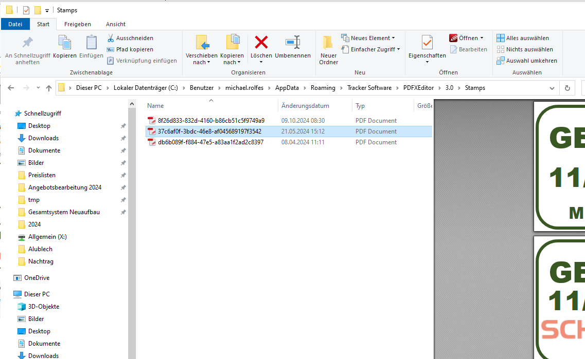 Nachdem du die PDF-Datei geschlossen hast, navigiere zu deinem lokalen Datenträger C: und wähle den Pfad „Benutzer“ oder „Users“, gefolgt von deinem Benutzernamen. Gehe dann zu „AppData“, „Roaming“, „Tracker Software“, „PDF-XChange Viewer“ oder "PDFXEditor" und schließlich zu „3.0“ und „Stamps“. Dort wählst du den gerade erstellten Stempel (erkennbar am Datum) aus und kopierst die Bezeichnung.