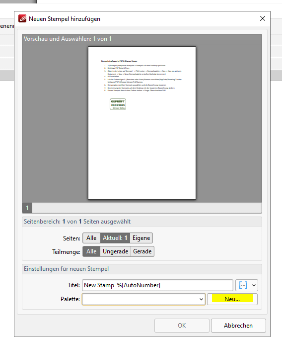 Erstelle einen neuen Stempel aus dem aktiven Dokument oder der Zwischenablage und erzeuge eine neue Stempelpalette und benennesie nach belieben.